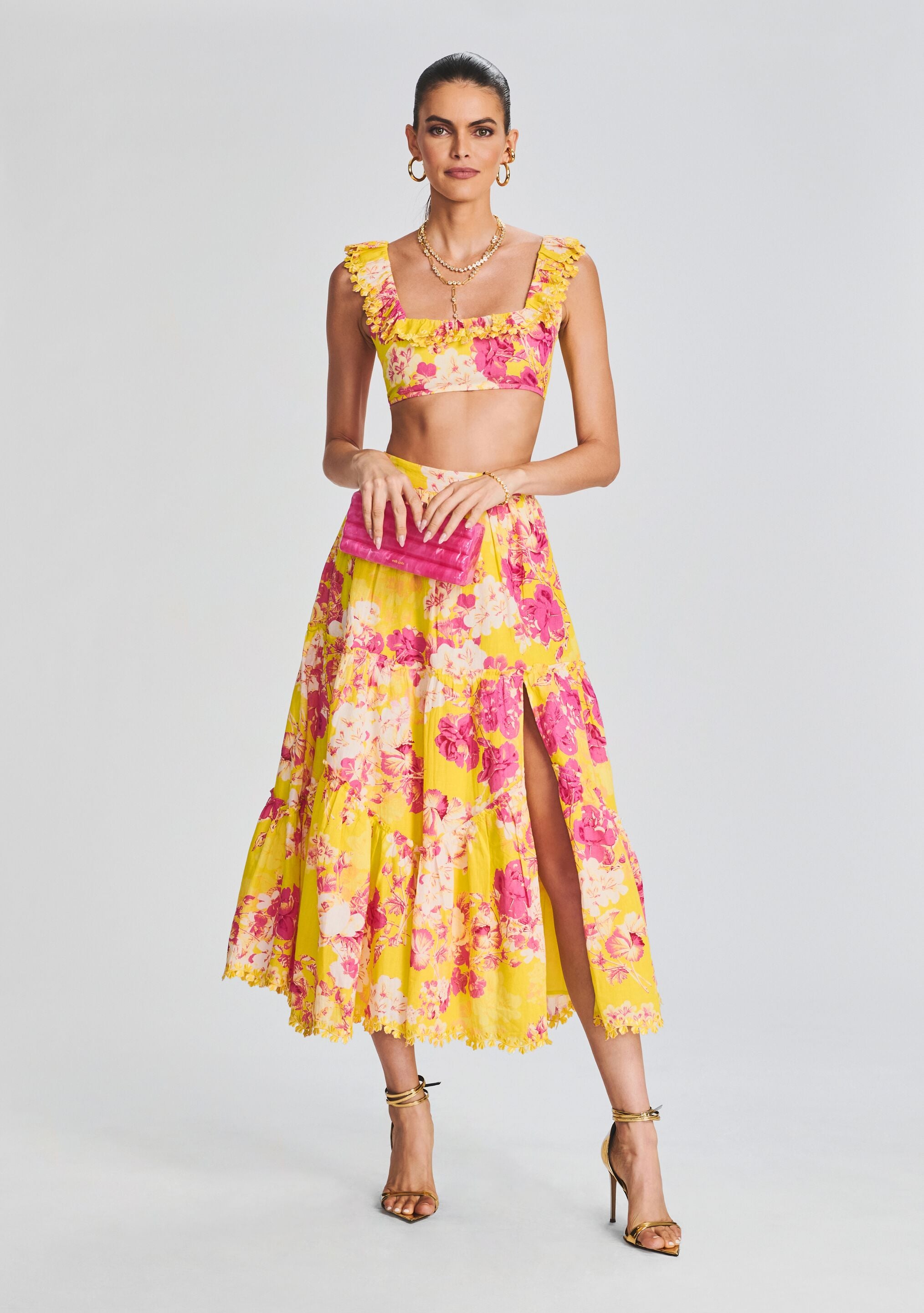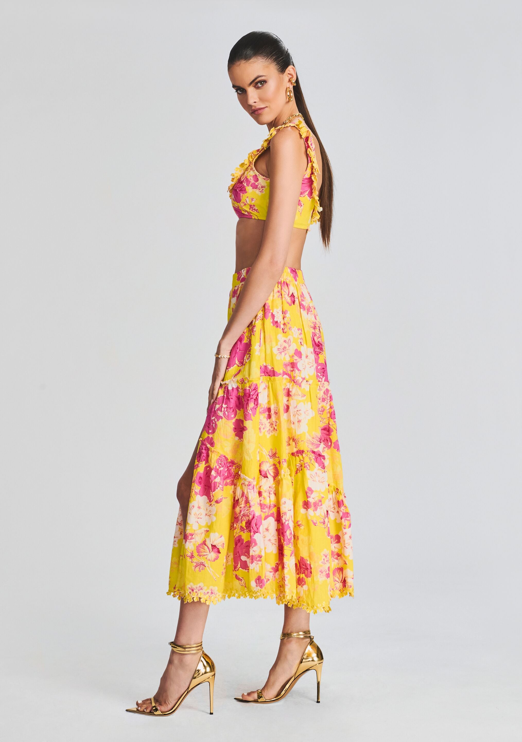 The Auril Top is a bright and playful crop top featuring a square neckline and ruffle trim. Pair it with the matching Auril Maxi Skirt to complete the look. Shown here in Yellow.